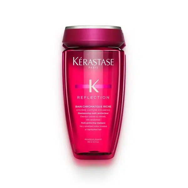 Bain Chromatique Riche is a colour radiance protecting shampoo for colour-treated or highlighted hair. Its innovative Système Capture Advanced captures pigments in the fibre. Its chelators complex fights all colour enemies including water particles, responsible for colour fading. UV Filters and Vitamin E protect from oxydative aggressions, while Rice Bran Oil nourishes the fiber to emphasise light refraction. The color stays true and vibrant, the hair texture is sublimated.